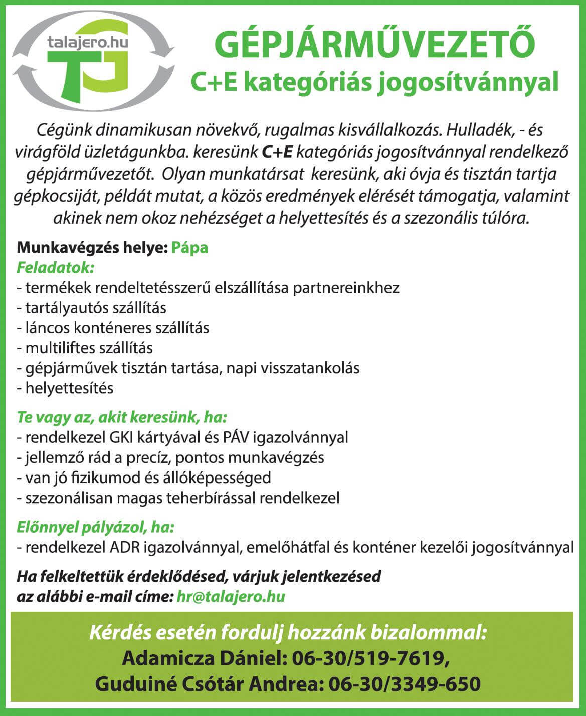 virágföld üzletágunkba. keresünk C+E kategóriás jogosítvánnyal rendelkező