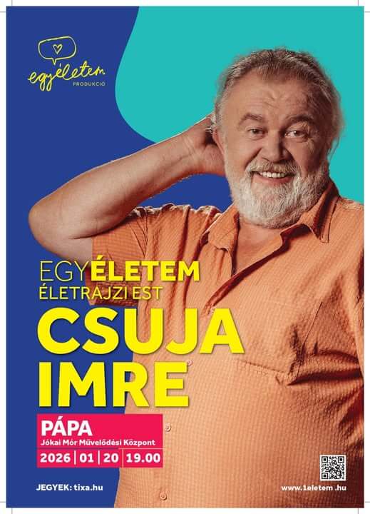 A Jászai Mari-díjas Csuja Imrét senkinek nem kell bemutatni.Pont úgy, ahogy megismertük őt: szerényen, viccesen, szívmelengetően. Mesél arról, hogy rendezte őt gyerekkorában az édesanyja, milyenek voltak az első évei a pályán, hogy játszott egy nap négy előadásban, miket tanult a szakma nagy öregjeiről vagy hogy ismerte meg a feleségét több mint 40 évvel ezelőtt. És természetesen szóba kerülnek a legendás filmek is, az Üvegtigris és a Valami Amerika, amikről sok apró műhelytitkot tudhatunk meg. Jegyértékesítés az Esterházy-kastély, a JMK és a Tourinform Iroda jegypénztárában!
