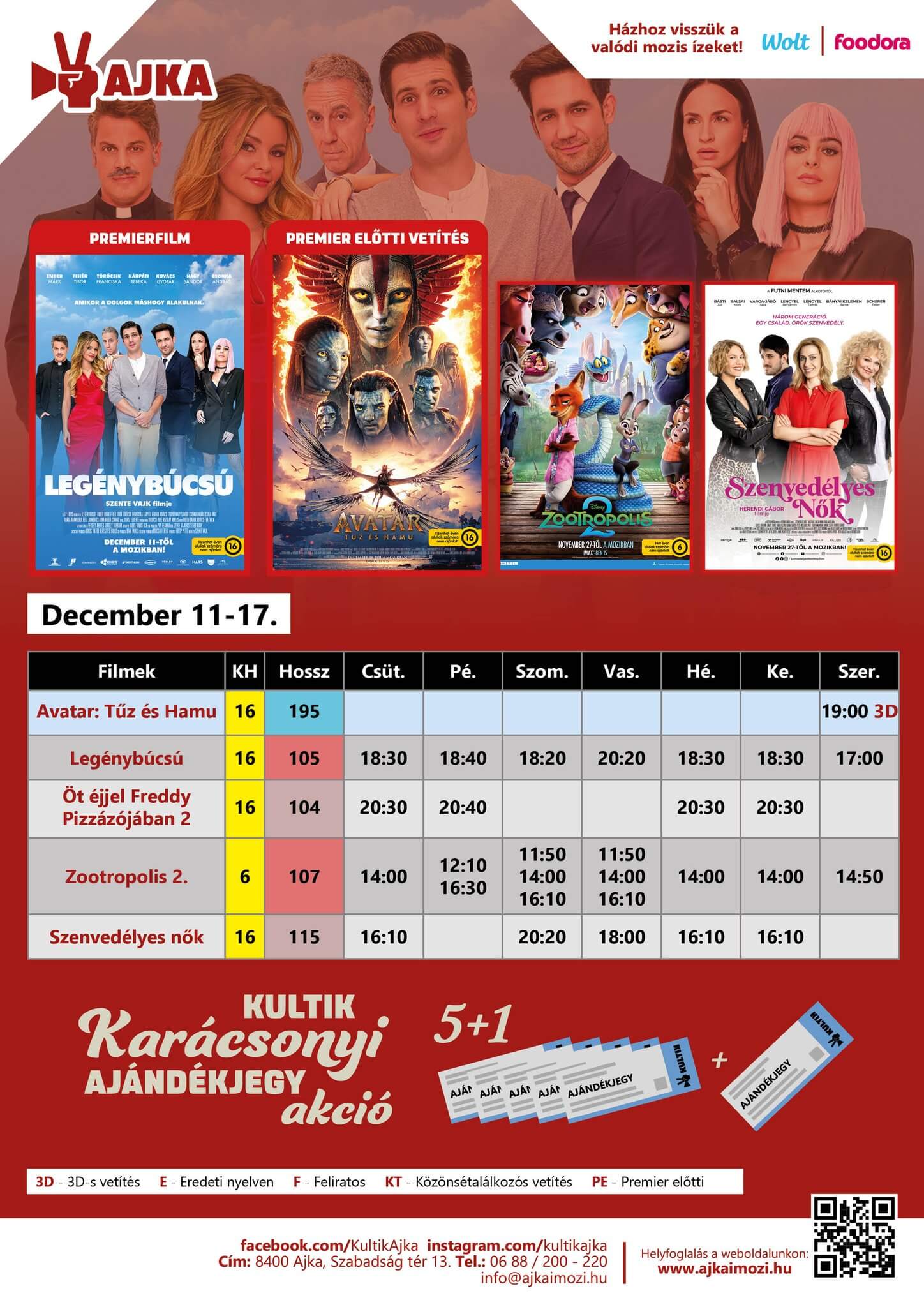 Avatar: Tűz és Hamu 3D – amerikai sci-fi, fantasy , 192 perc (16) – vetítési időpontok: szerda 19:00.