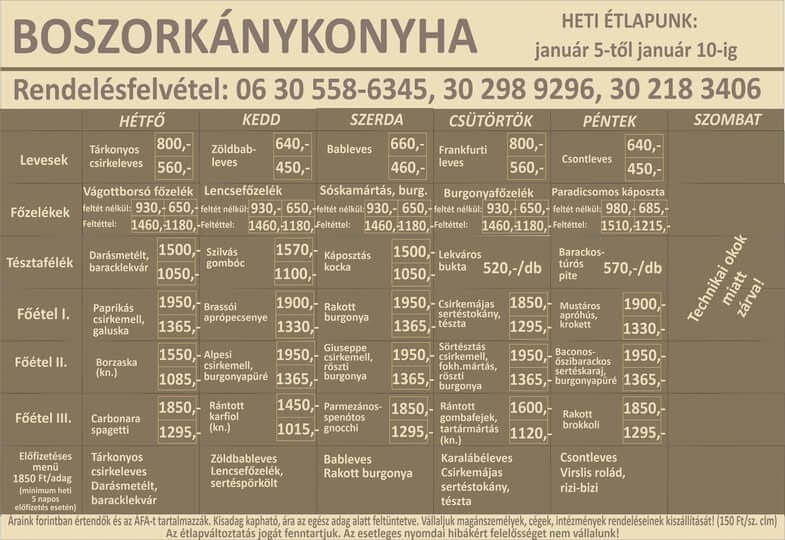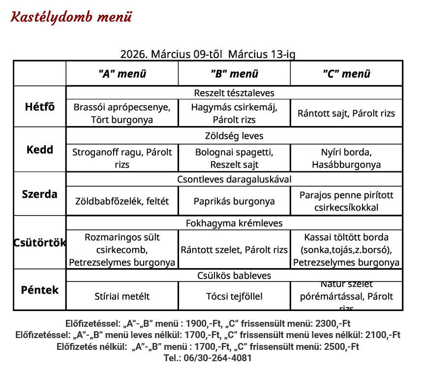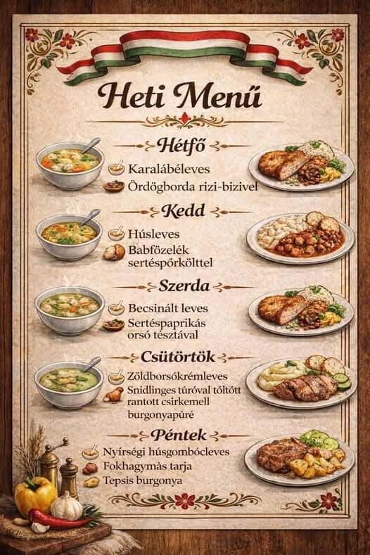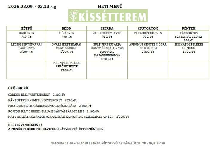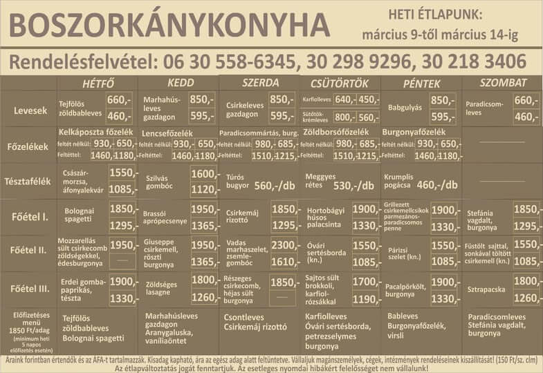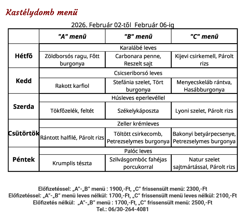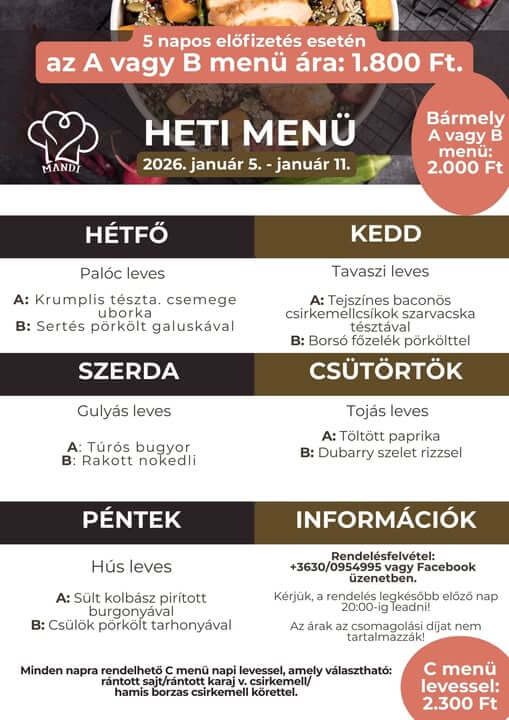 Előrendelést felveszünk előző nap 19 óráig. (előrendelés nélkül csak a készlet erejéig tudjuk kiszolgálni vendégeinket) A pénteki menük nagy érdeklődésére való tekintettel, érdemes már szerdán leadni az előrendelést.