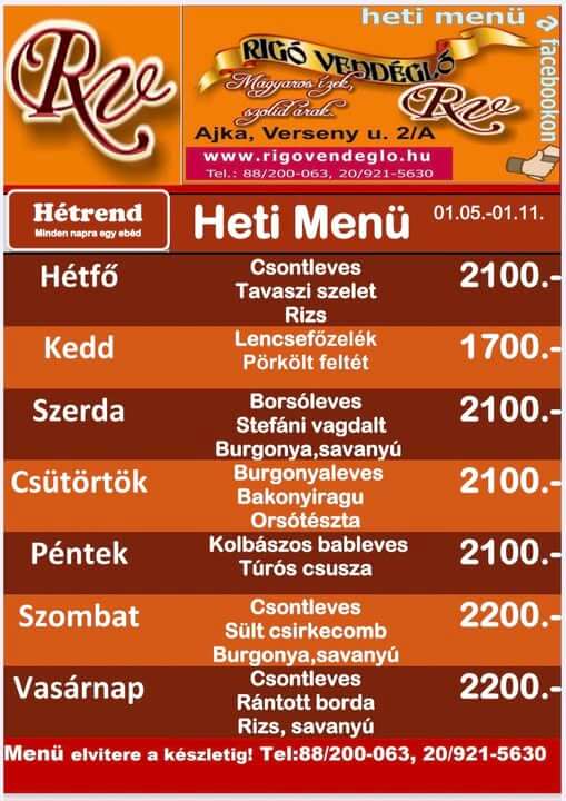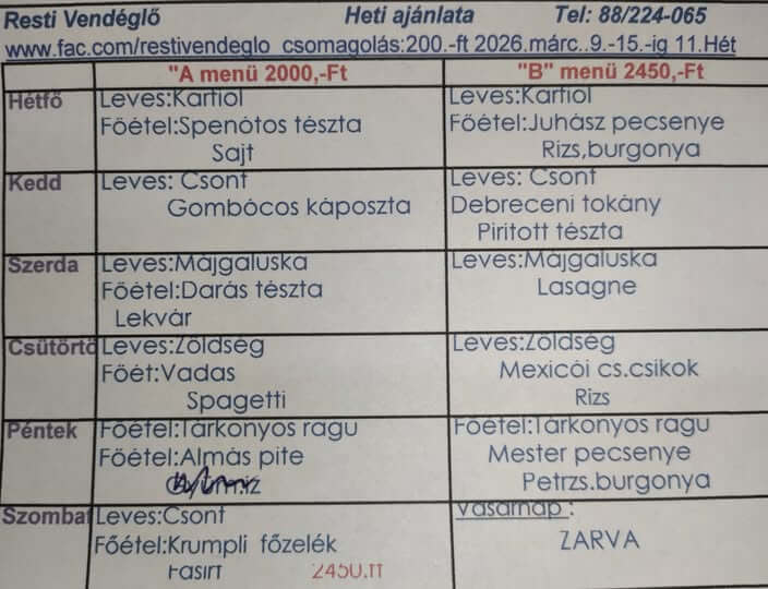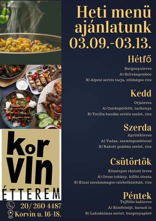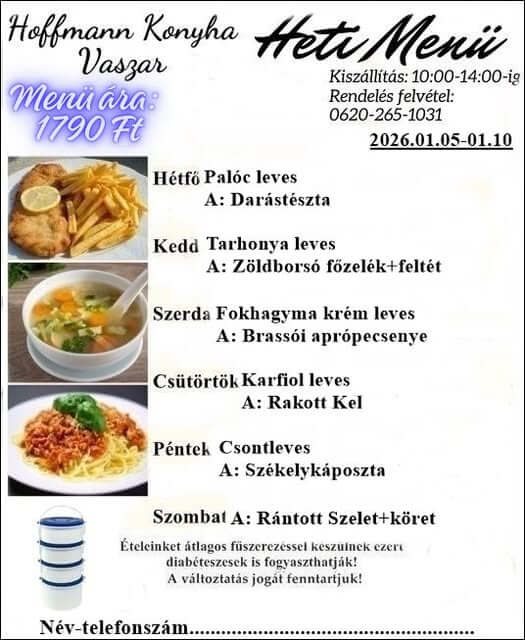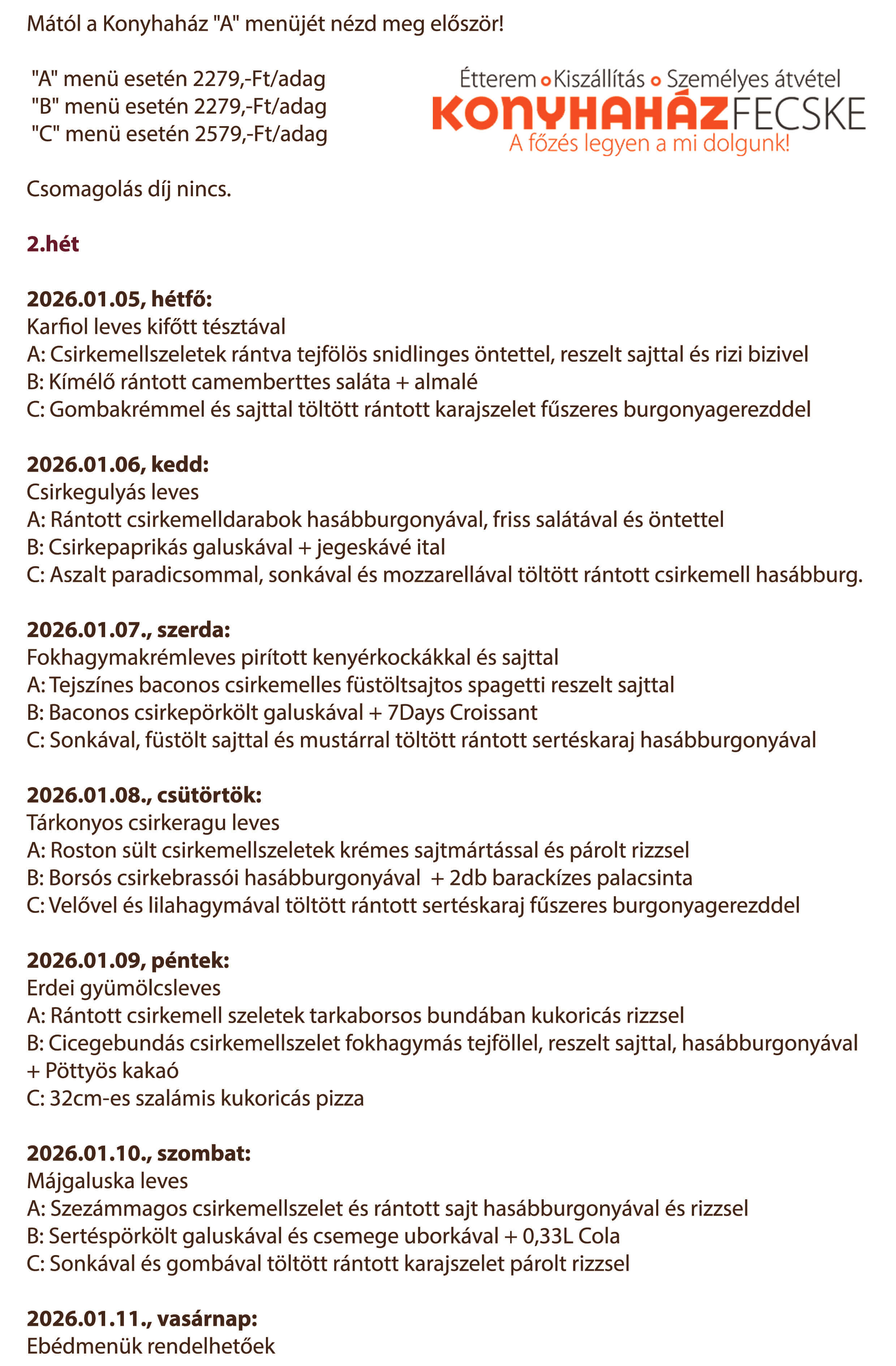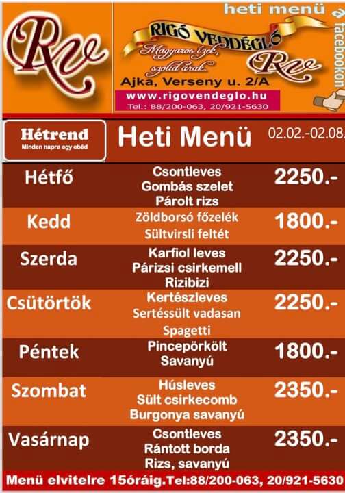 Előrendelést felveszünk előző nap 19 óráig. (előrendelés nélkül csak a készlet erejéig tudjuk kiszolgálni vendégeinket) A pénteki menük nagy érdeklődésére való tekintettel, érdemes már szerdán leadni az előrendelést.