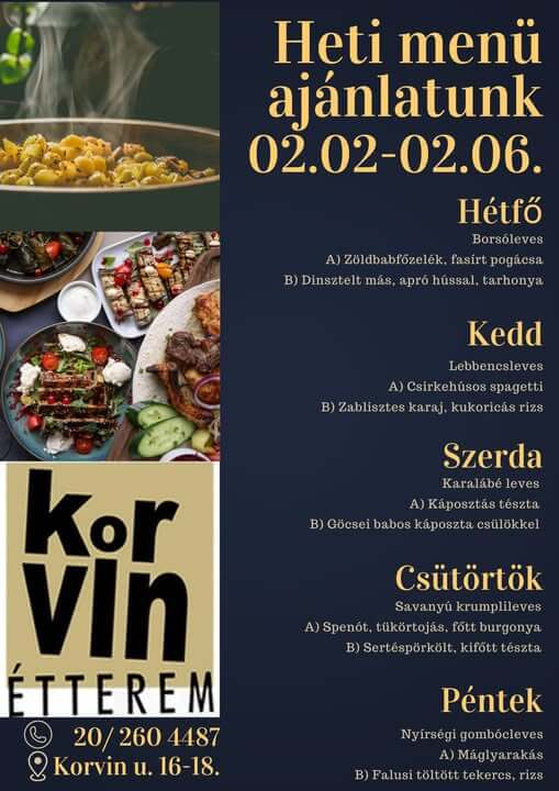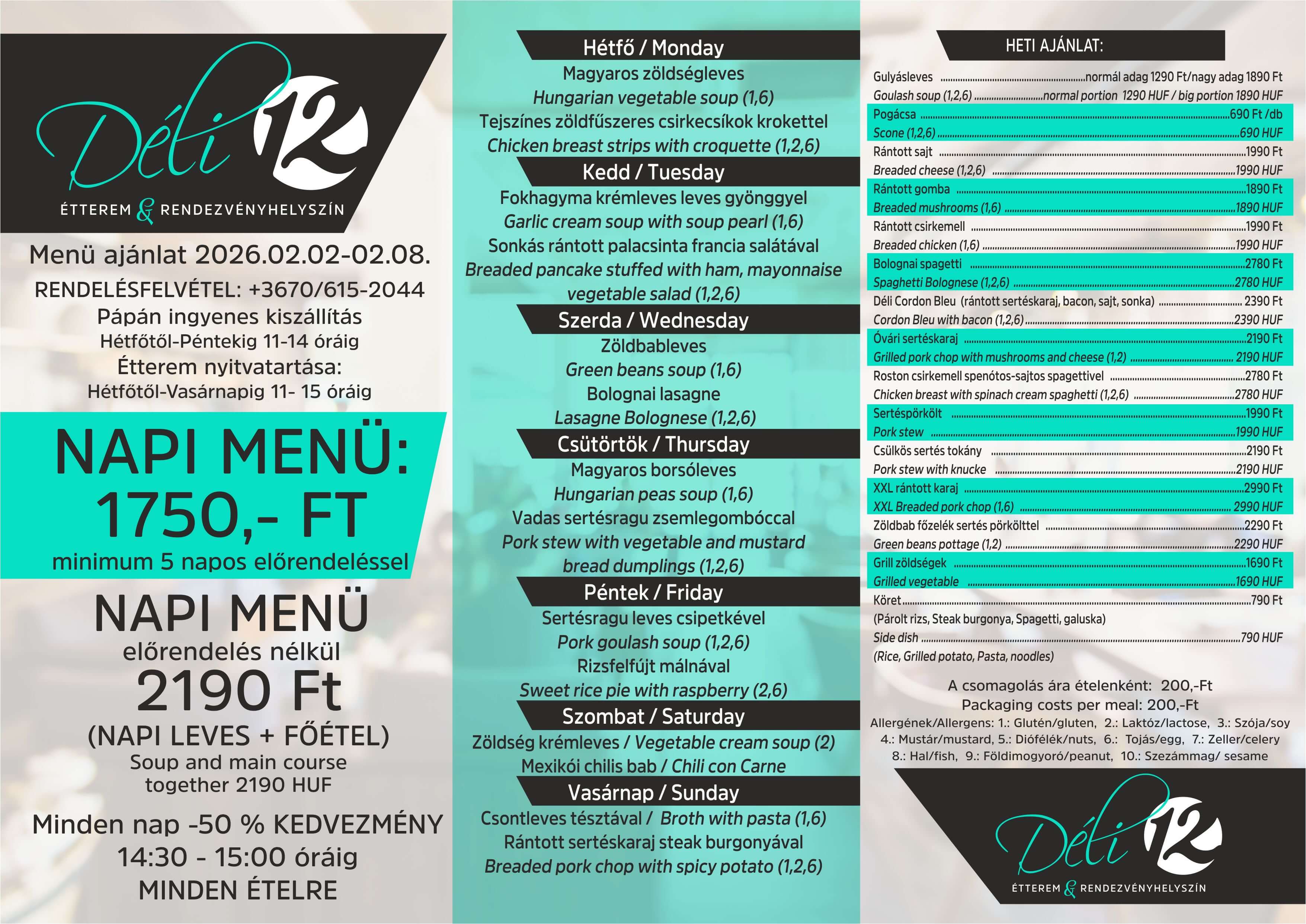 Déli menü hétfőtől szombatig 11-15 óra között
