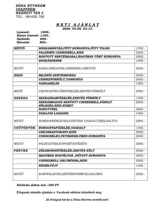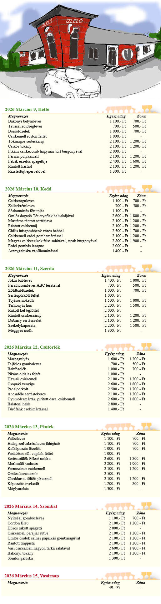 Legnépszerűbb szolgáltatásunk a menükínálat: délelőtt 11 és este 20 óra között korlátlan levesfogyasztás, hétköznapokon kétfajta (A és B) szombatonként egyfajta második fogás várja kedves vendégeinket.