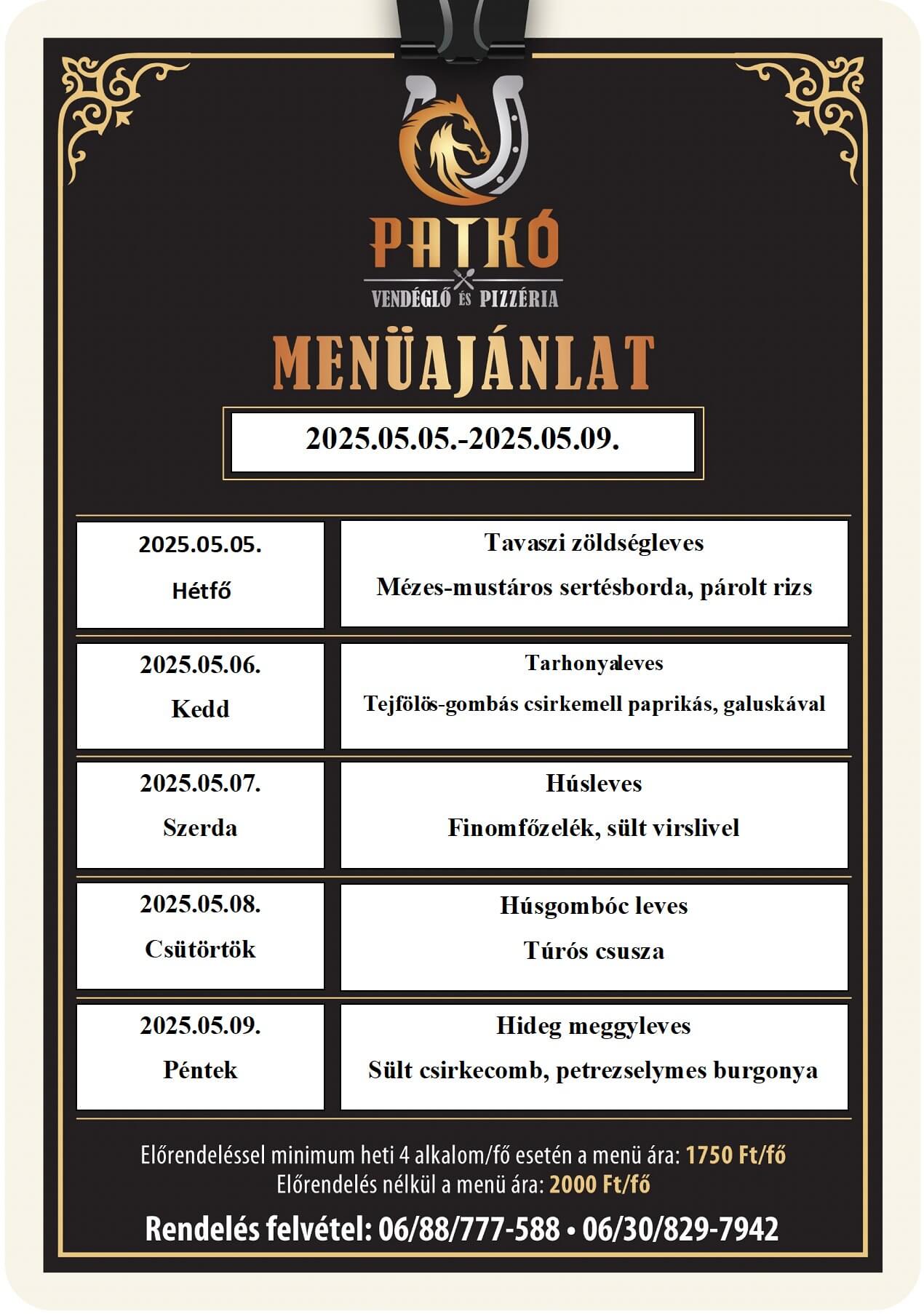 Előrendelést felveszünk előző nap 19 óráig. (előrendelés nélkül csak a készlet erejéig tudjuk kiszolgálni vendégeinket) A pénteki menük nagy érdeklődésére való tekintettel, érdemes már szerdán leadni az előrendelést.