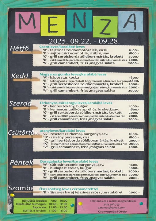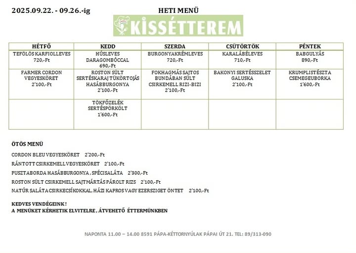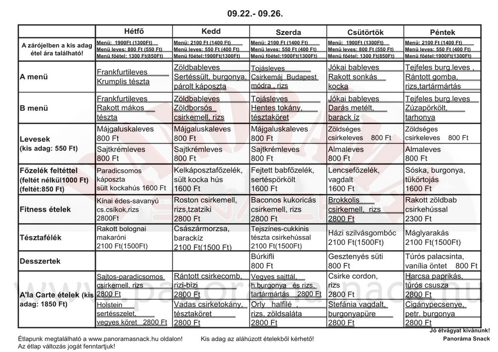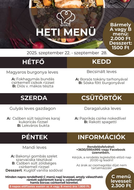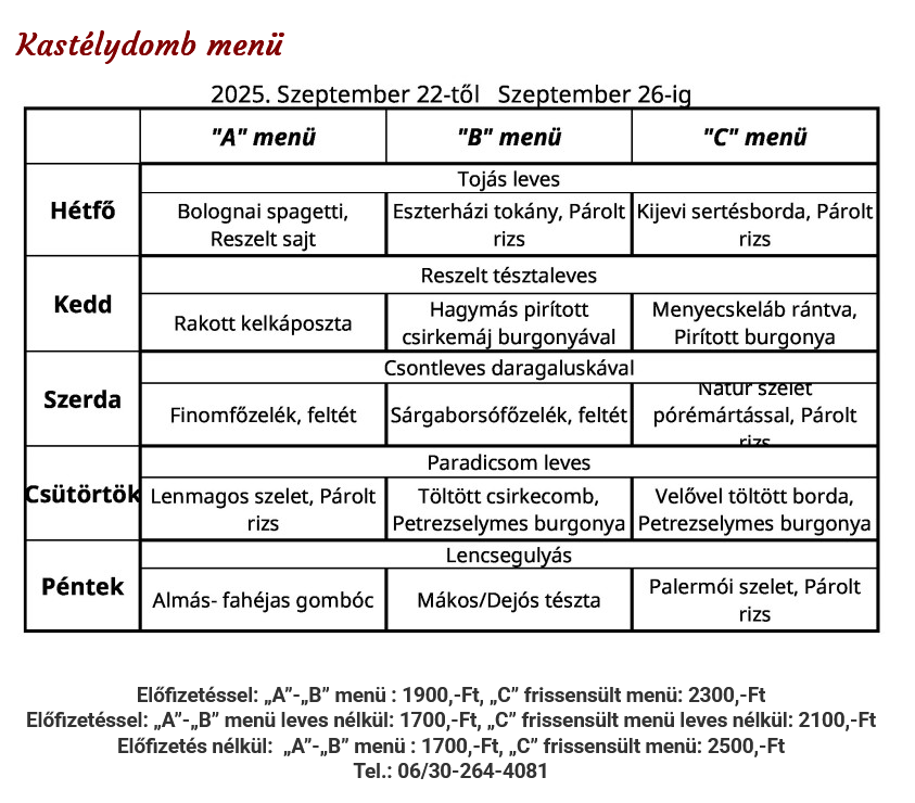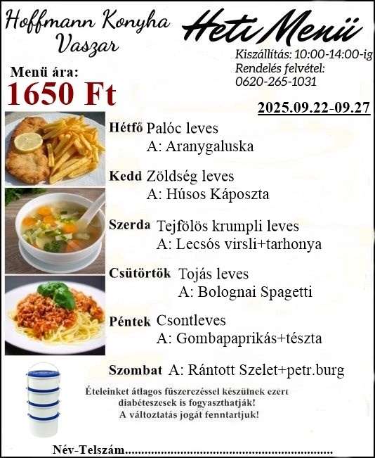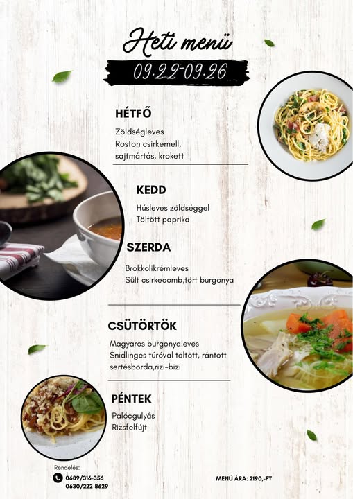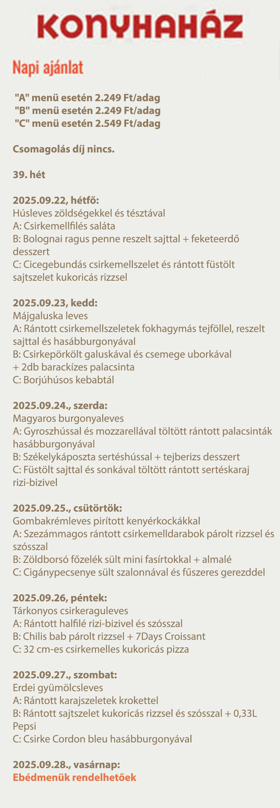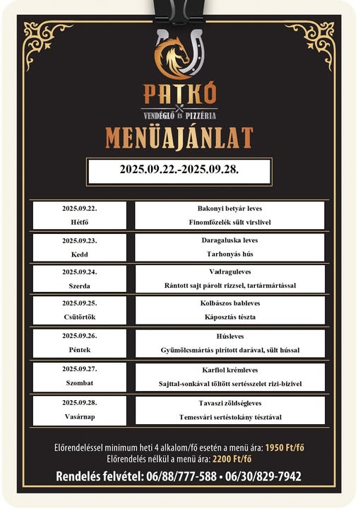 Előrendelést felveszünk előző nap 19 óráig. (előrendelés nélkül csak a készlet erejéig tudjuk kiszolgálni vendégeinket) A pénteki menük nagy érdeklődésére való tekintettel, érdemes már szerdán leadni az előrendelést.