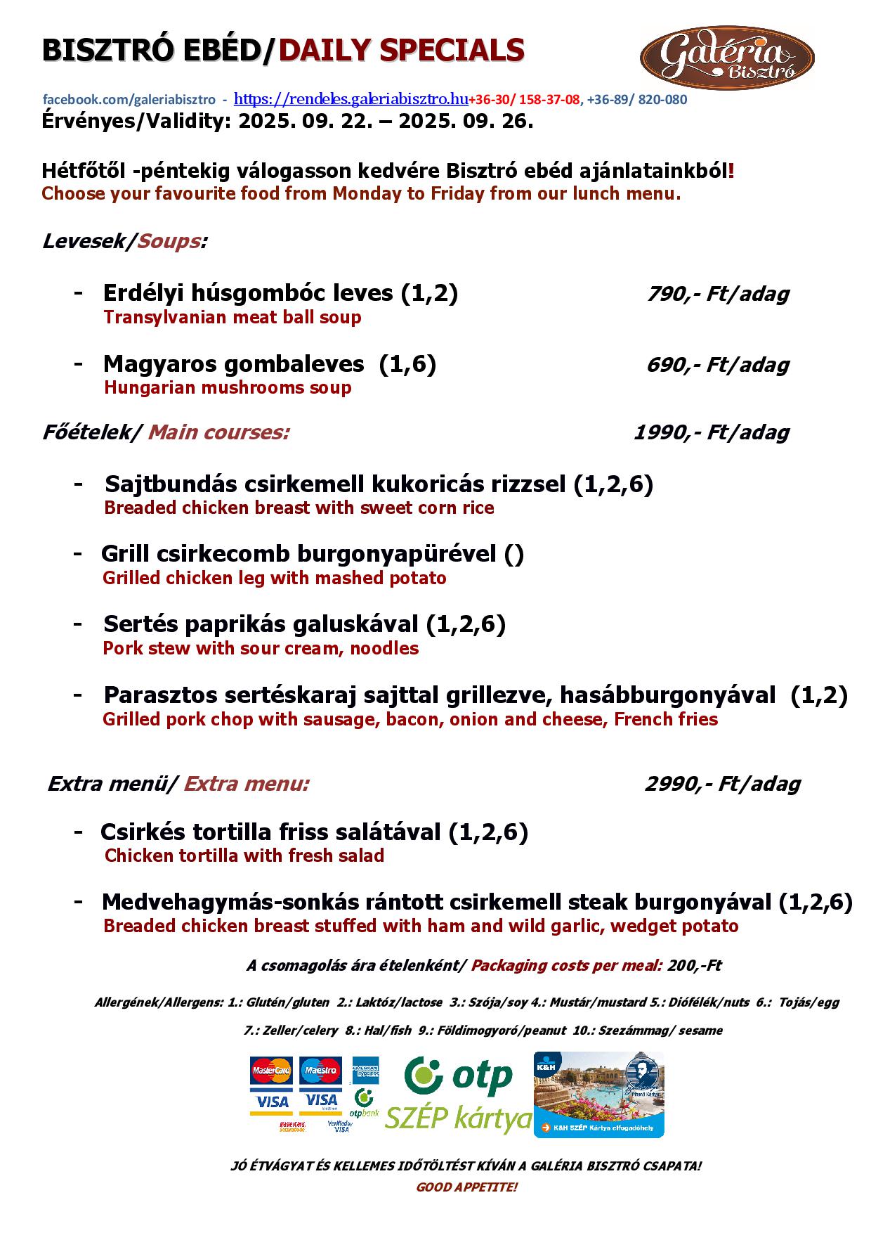 Már a Bisztró Menüt is házhoz szállítjuk, így kimozdulás nélkül is élvezhetitek a hetente megújuló, ízletes ebéd menünket! Rendeléseteket leadhatjátok a www.galeriabisztro.hu/