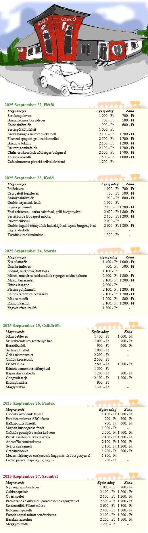 Legnépszerűbb szolgáltatásunk a menükínálat: délelőtt 11 és este 20 óra között korlátlan levesfogyasztás, hétköznapokon kétfajta (A és B) szombatonként egyfajta második fogás várja kedves vendégeinket.
