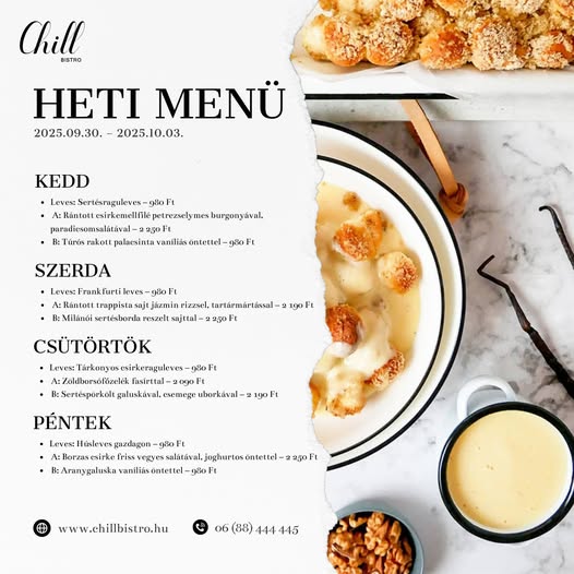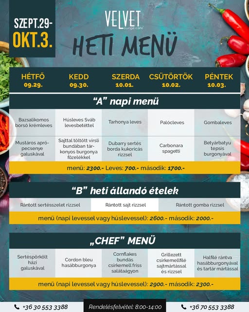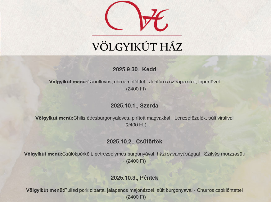 A Völgykút Ház Bowling kávézójának heti menü ajánlata: