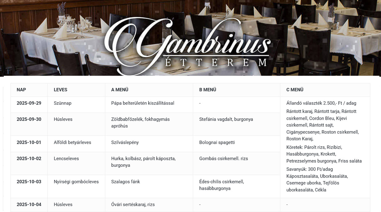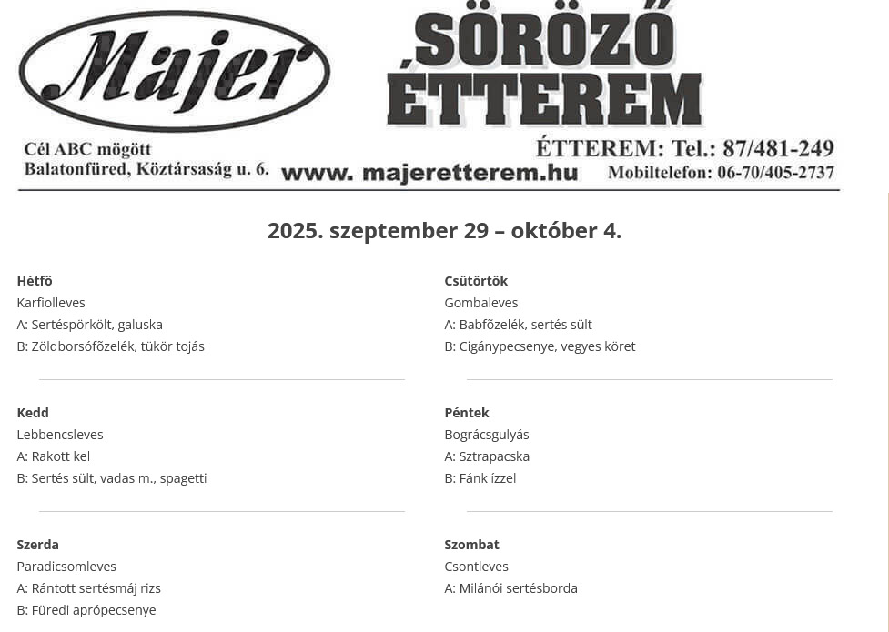 Legnépszerűbb szolgáltatásunk a menükínálat: délelőtt 11 és este 20 óra között korlátlan levesfogyasztás, hétköznapokon kétfajta (A és B) szombatonként egyfajta második fogás várja kedves vendégeinket.