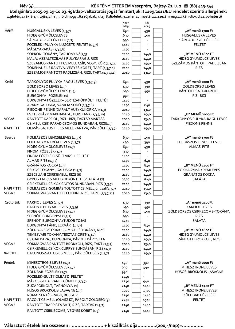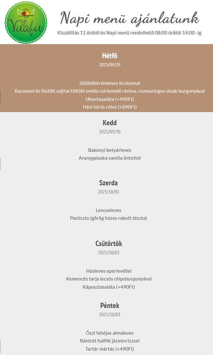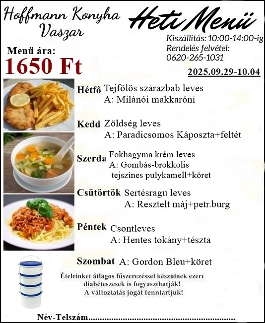 Heti menü esetén új rendelést legkorábban a következő napra tudunk felvenni.