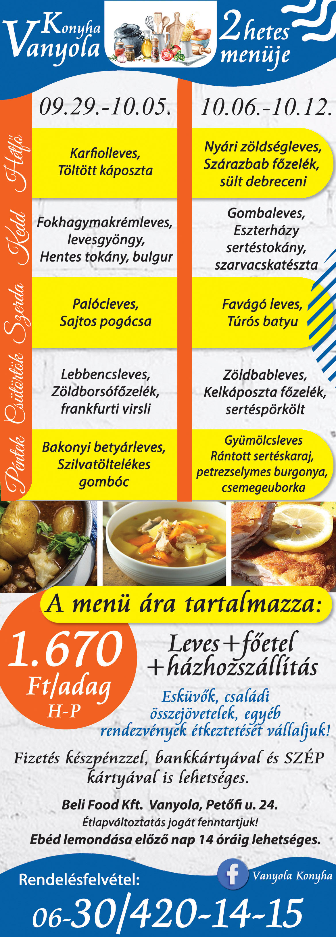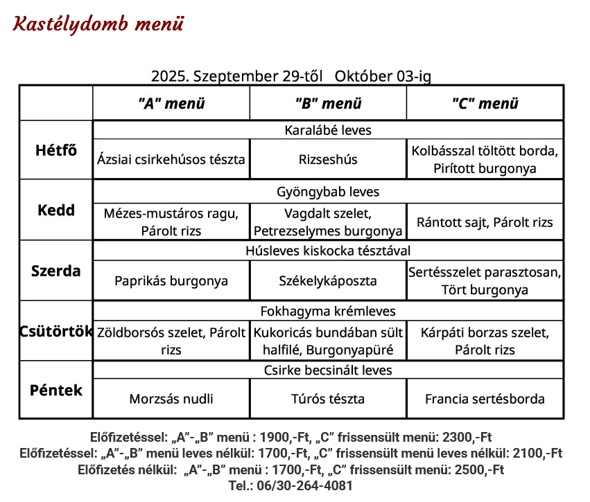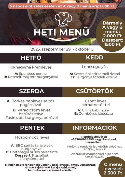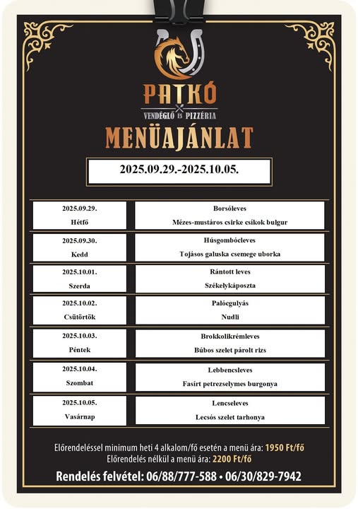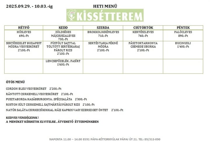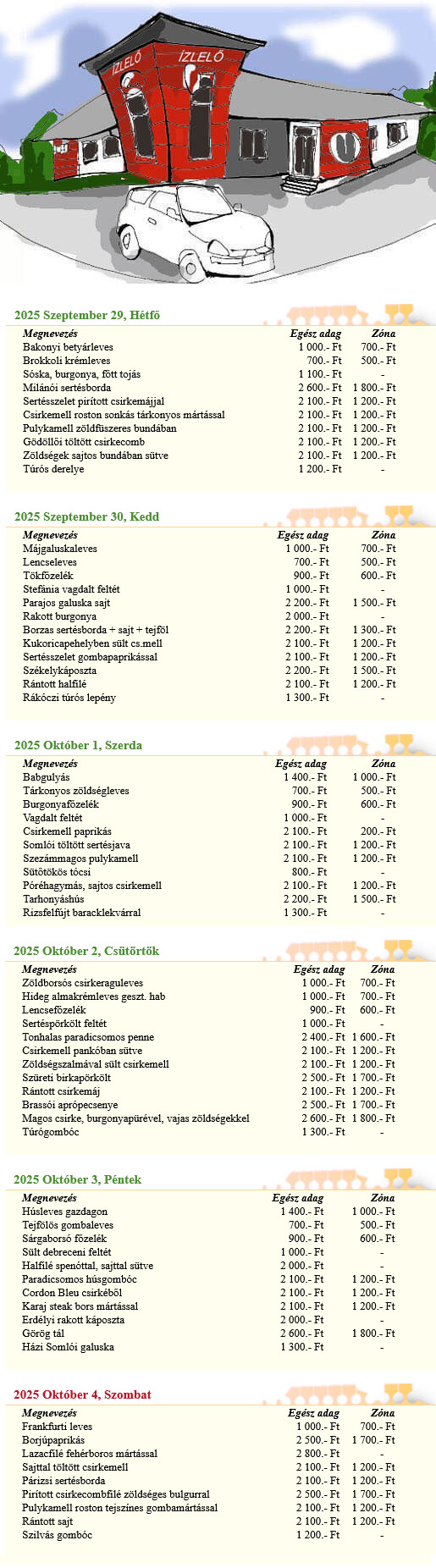 Előrendelést felveszünk előző nap 19 óráig. (előrendelés nélkül csak a készlet erejéig tudjuk kiszolgálni vendégeinket) A pénteki menük nagy érdeklődésére való tekintettel, érdemes már szerdán leadni az előrendelést.