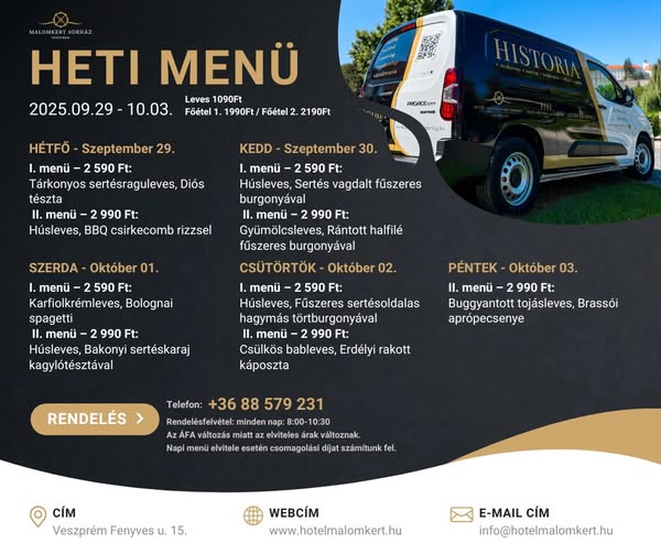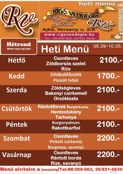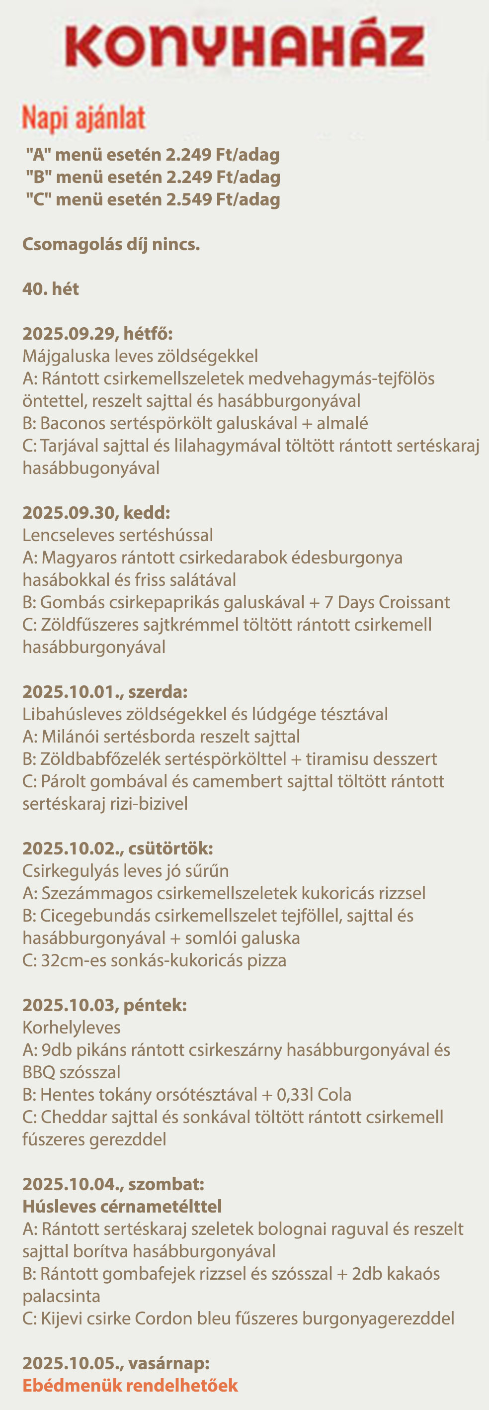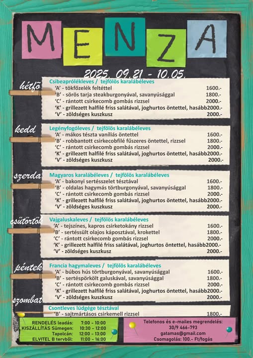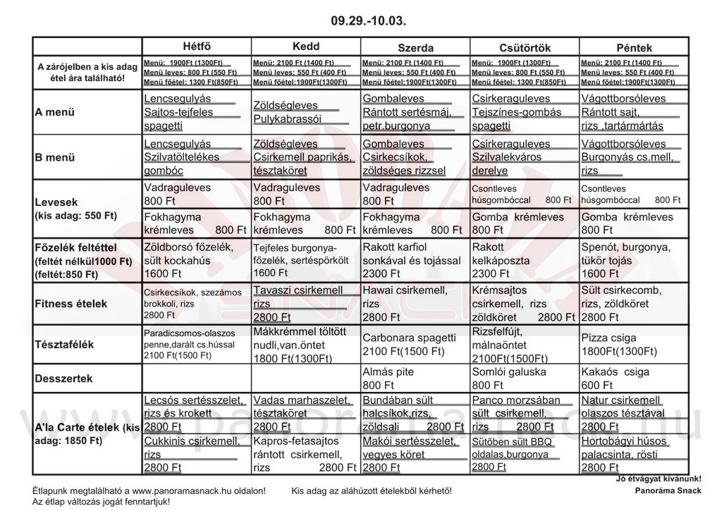 Előrendelést felveszünk előző nap 19 óráig. (előrendelés nélkül csak a készlet erejéig tudjuk kiszolgálni vendégeinket) A pénteki menük nagy érdeklődésére való tekintettel, érdemes már szerdán leadni az előrendelést.