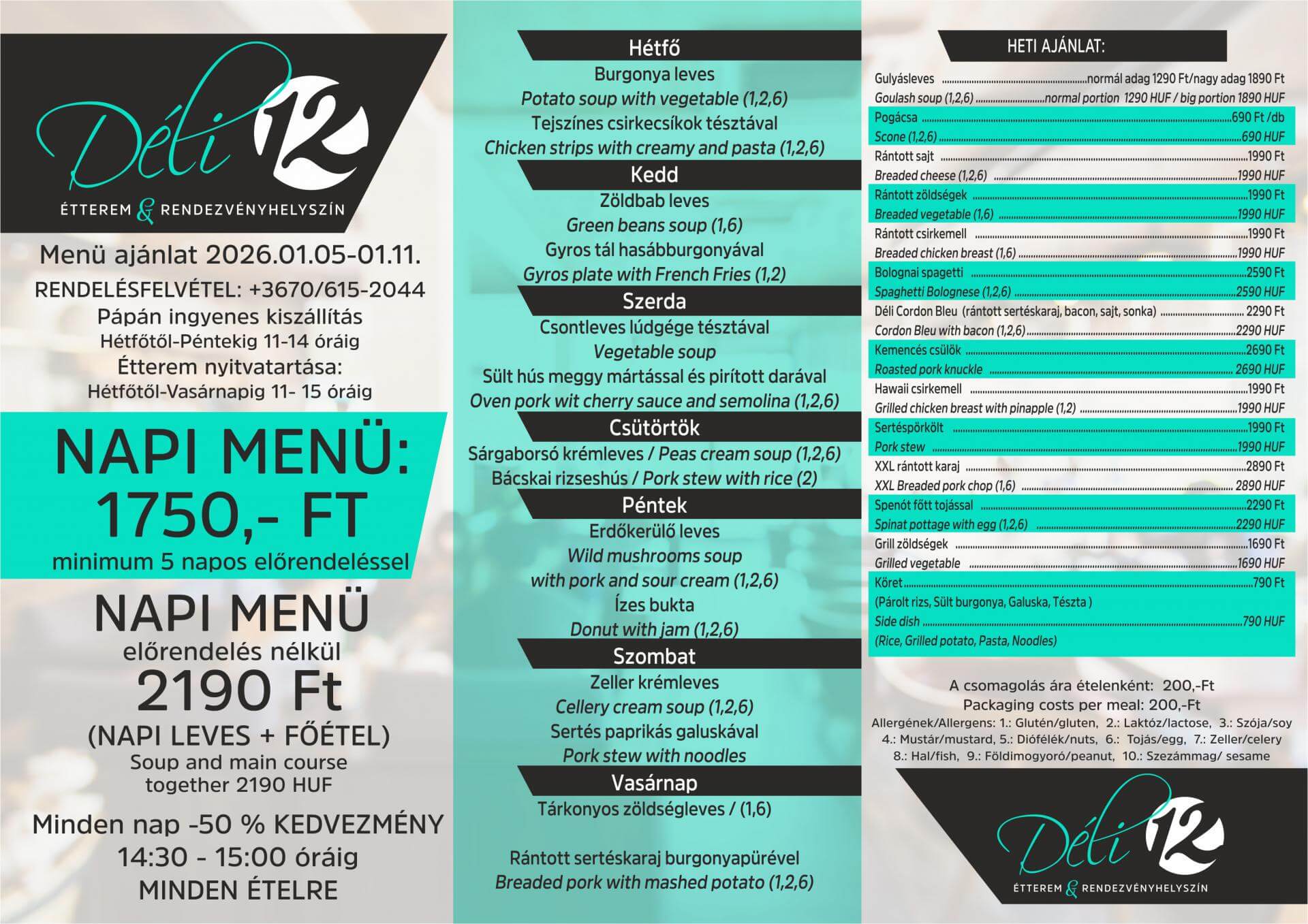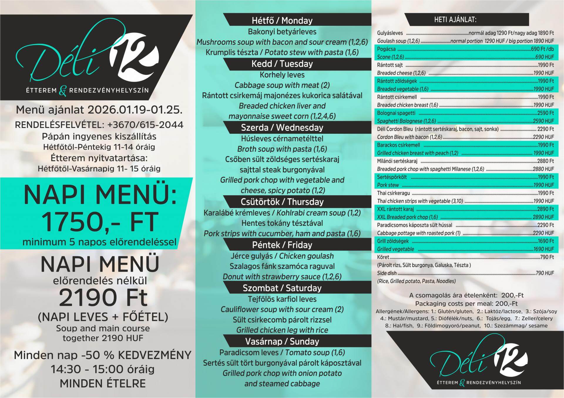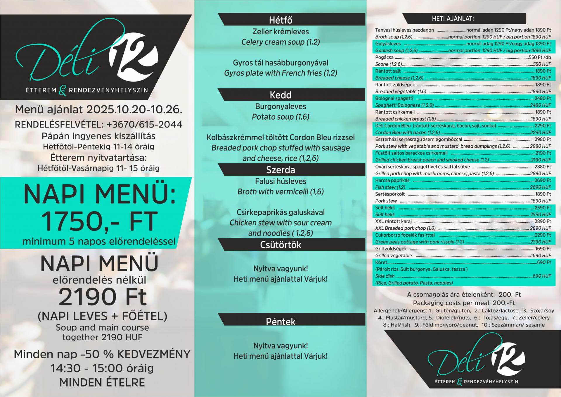 Aktuális heti menü - Déli12 Étterem és Rendezvényhelyszín