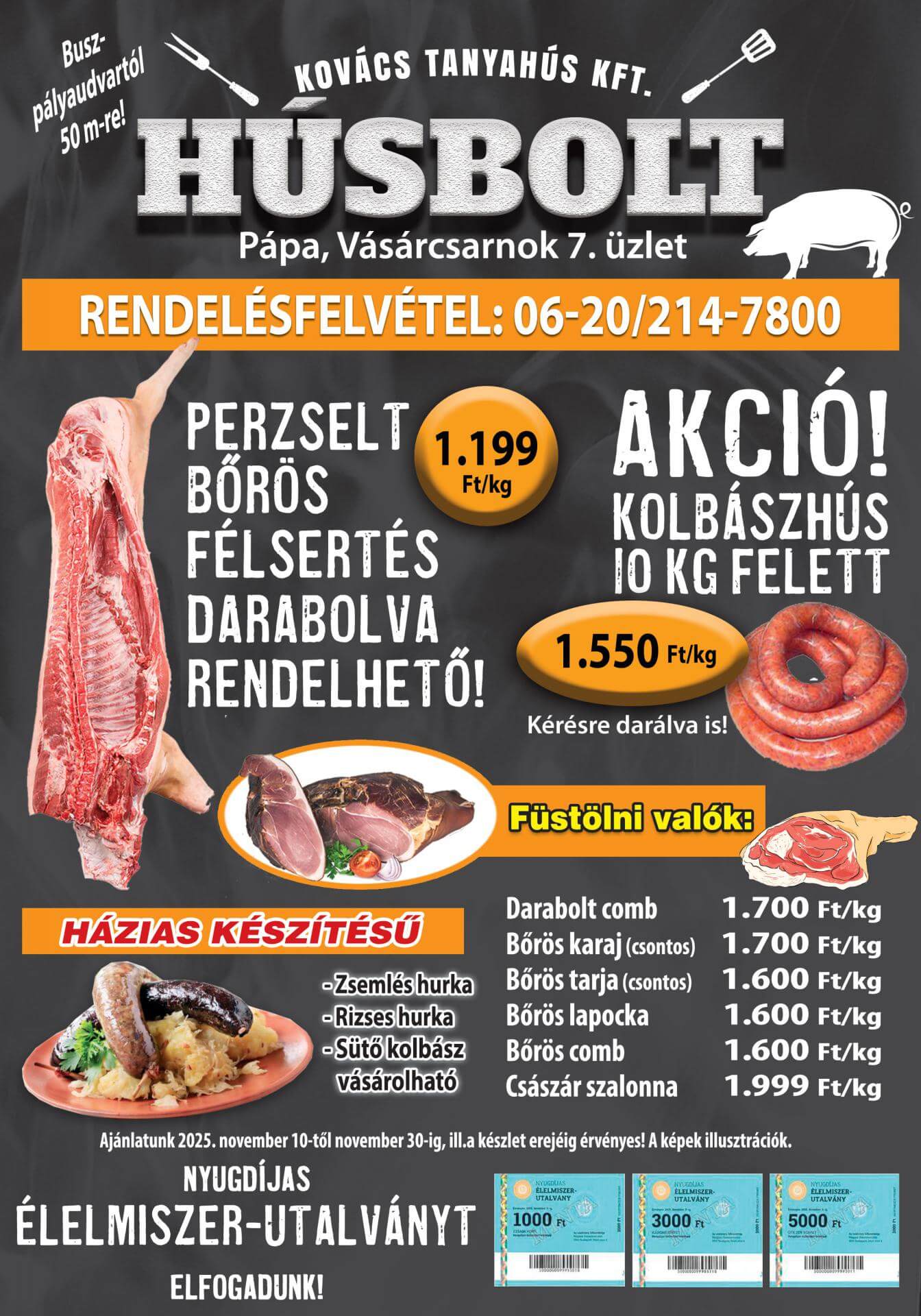 Perzselt félsertés, akciós kolbászhús, füstölni valók, stb.