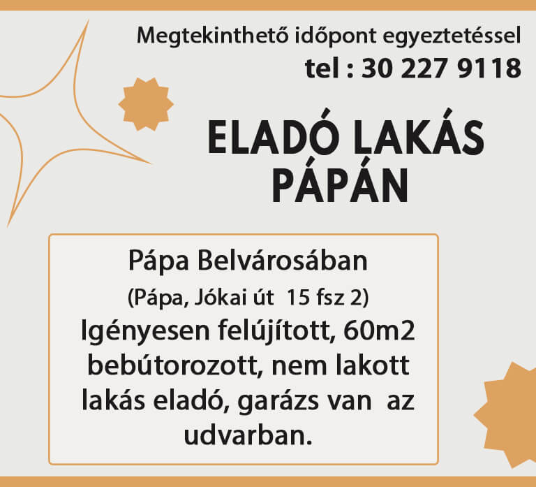Eladó lakás Pápa Belvárosában (Pápa, Jókai út 15 fsz 2). Igényesen felújított, 60m2 bebútorozott, nem lakott lakás eladó, garázs van az udvarban.