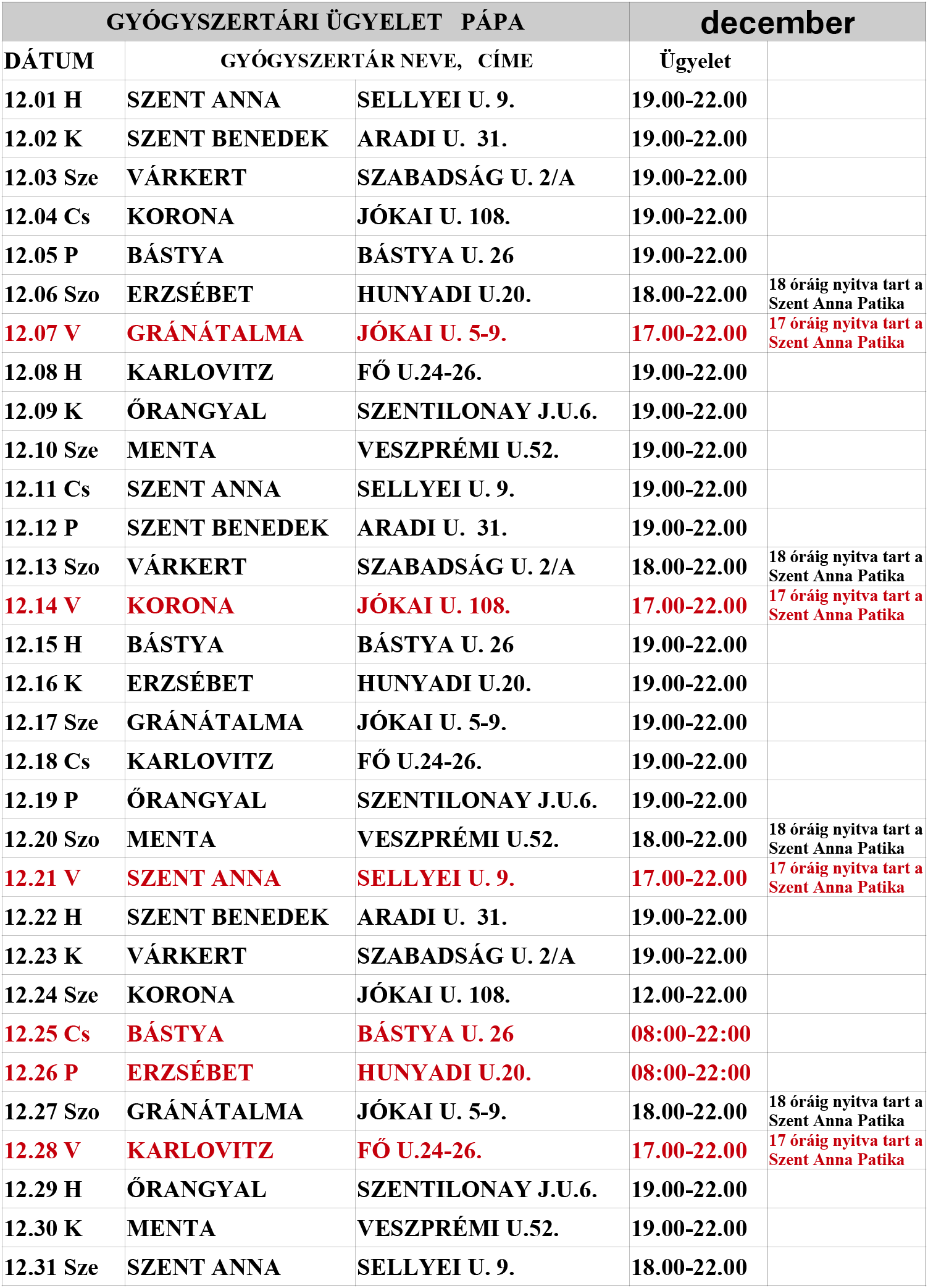 Pápa Város Gyógyszertárainak ügyeleti rendje 2025. december 1-től 2025. december 31-ig
