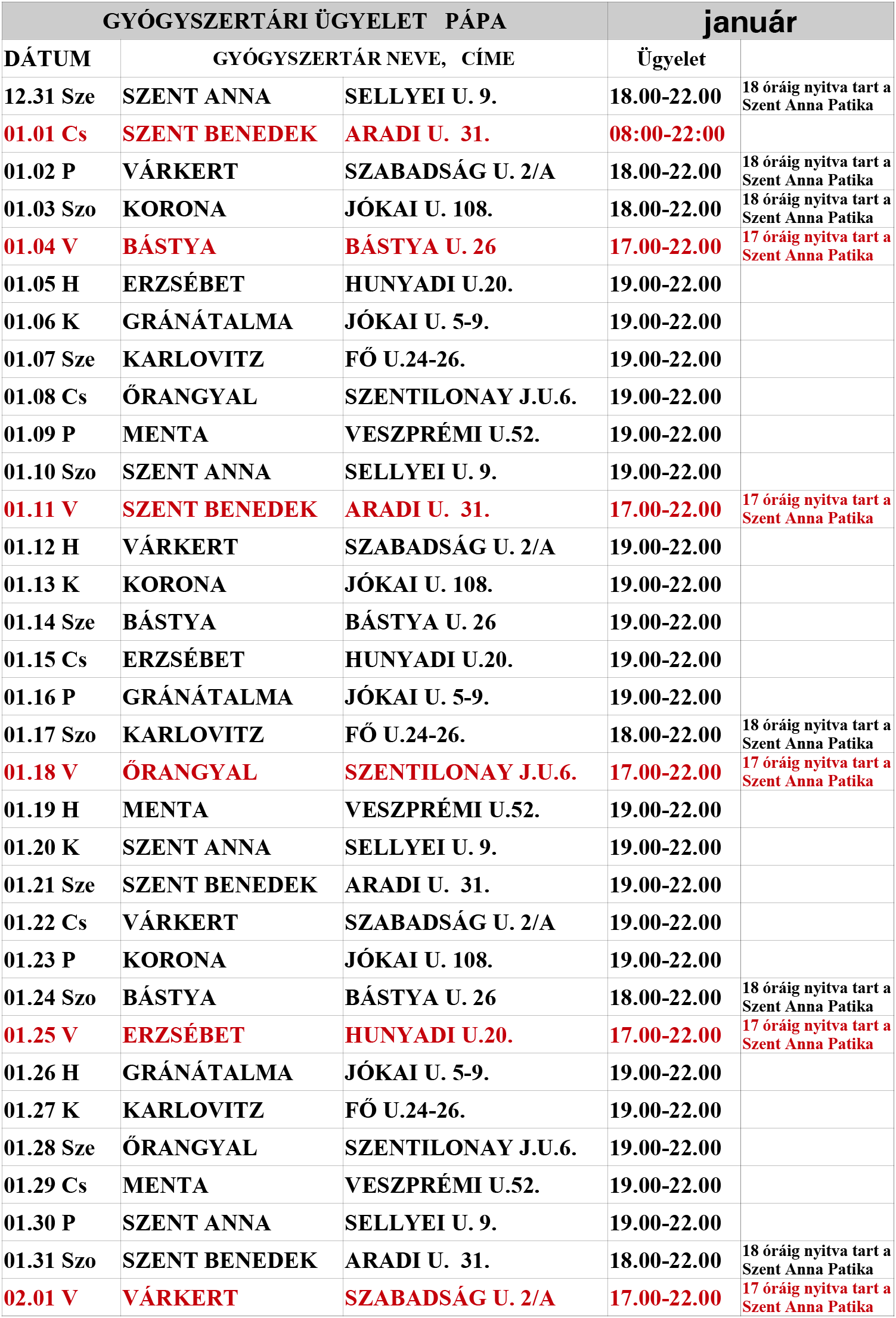 Pápa Város Gyógyszertárainak ügyeleti rendje 2026. január 1-től 2026. január 31-ig